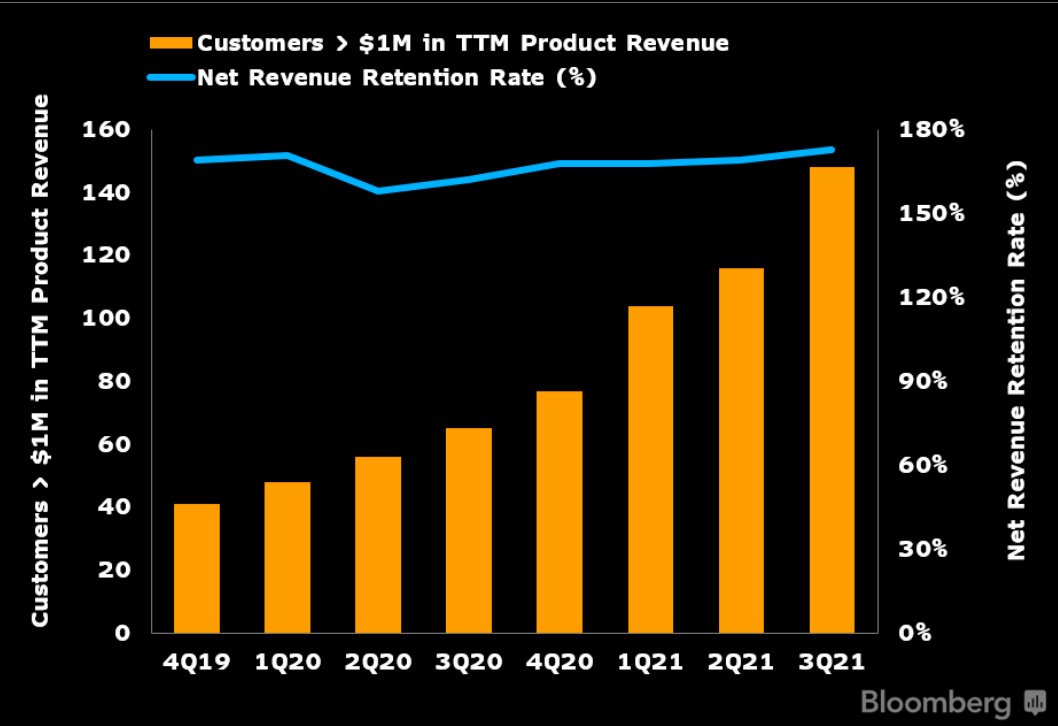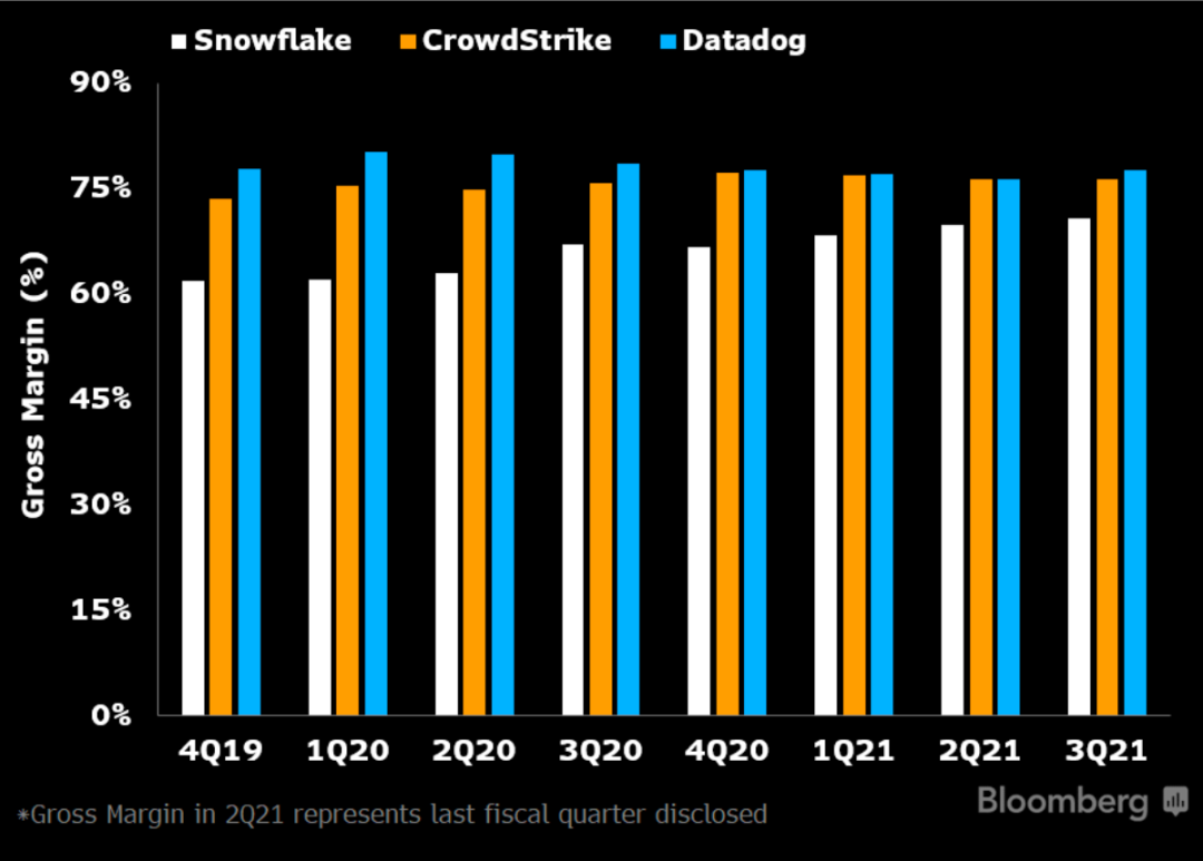 Snowflake的利润率继续显示出改善。2021财年第三季度的总毛利率为65% ,调整后总毛利率为71%。调整后的产品毛利率为74.6% ,而上一季度为73.6% ,去年同期为70% 。虽然Snowflake65%的总毛利率比Datadog、 CrowdStrike 和 Okta 等云计算同行至少低10个百分点,但稳定的客户增长和附加产品可以帮助公司到2022年达到至少70%的总毛利率(Gross Margin),且不久的将来,公司的毛利率将会与其竞争对手持平或超越。Snowflake以使用为基础的定价存储和计算和多云支持已被证明是一个区别于云提供商收取周期性的订阅费用,而不管产品使用。高净保留率可能支持Snowflake的定价权,因为客户标准化其产品,以分析多云环境中的大量数据。