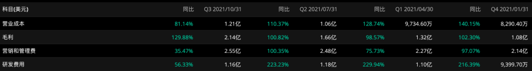 公司财务方面,Snowflake在营业总收入上已经连续5个季度保持100%以上的快速增长。即便当前公司净利润与营业净利润仍处于负1.5亿美金左右,但是对于类似Snowflake这种正处于高速增长的公司来说,大部分的收入都需要投资到产品研发与广告投入上面为保持其前期竞争力以拉开与其竞争对手的距离,因此长期来看并不会产生负面影响。但是Snowflake也面临不少潜在风险。Snowflake目前的收入增长率可能无法长期维持。管理层预计长期产品收入将增长30% 。整体收入增长从2020财年的174% 下降到2021财年的124% ,分析师预计今年的收入同比增长约104% 。