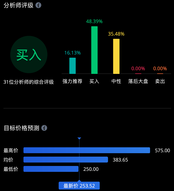 当前31位华尔街的分析师给予Snowflake的综合评级为:买入。其中最高价格预测与最低价格预测分别为$575和$250。