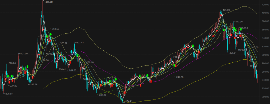 K线在不久将会结束超跌形态,并进入空头区间开启震荡行情。当K线震荡自多空分水岭(紫线,$230区间)附近或触及后,股价将会继续下跌,并触及历史底点,届时为理想布局与买入点。我们认为这种情况发生的几率最大是由于当前市场大盘整体行情偏消极,大几率会维持下跌行情。因此,即便市场资金对SNOW大多持积极态度,但不排除有羊群效应的可能。