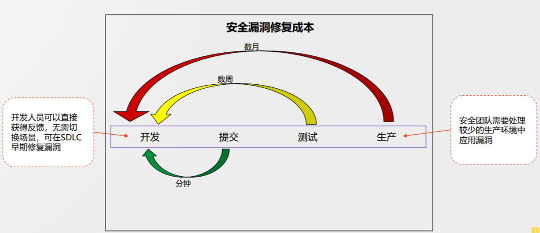 如前文所述,传统业务模式下,反馈周期长、成本高、修复难度大,而新的DevSecOps可以从基础的应用安全扫描能力开始,构建端到端安全能力,将安全左移方法论嵌入到CI/CD里。