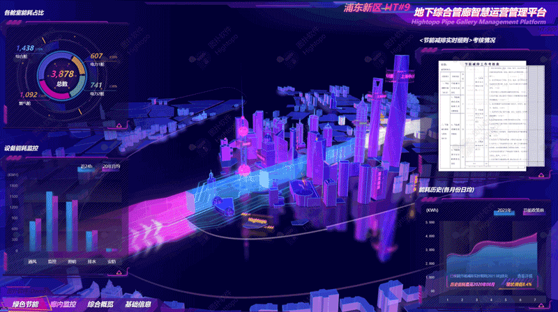 Hightopo 3D 可视化综合管廊系统摒弃传统运维管理模式的缺陷,打造“绿色管廊监管运维一体化”体系。城市地下综合管廊安全运营与智慧管控主要集成环境监控、管廊本体监控、人员设备定位、入侵探测安全防范等,构建环境、设施、设备与结构安全体系,最终基于 3D GIS+BIM+全景的管廊安全监测监控综合集成、联动报警与控制,并基于 ITSS 的综合管廊智能运维与服务,建立运维、成本与管理等服务的地下管廊综合评价指标体系,全面考核管廊安全健康状况、运维服务情况以及成本与管理情况,全面构建城市地下综合管廊安全运营与智慧管控体系。