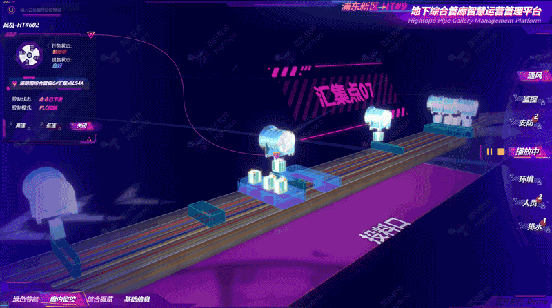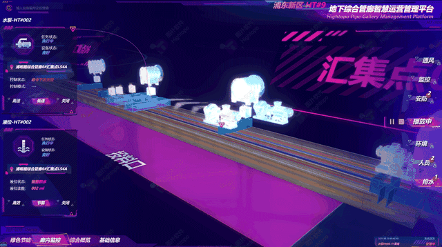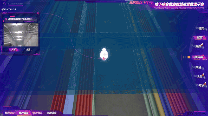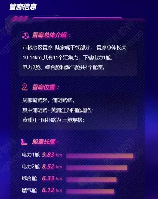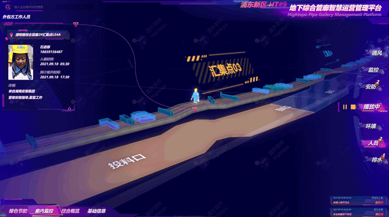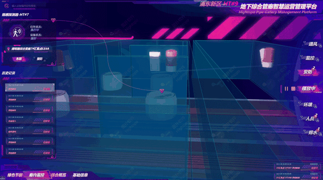Hightopo 的可视化大屏展示陆家嘴干线部分的管廊敷设情况,管廊总体长度 10.14 km,共有 11 个汇集点。综合管廊依托智慧管廊综合运营管理平台,通过管廊内布设的红外对射报警、传感器、人员定位系统等智能设备,对管廊内部的环境参数、设备状态进行实时监测,及时处理管廊内部报警信息及远程调度工作。