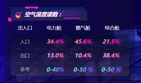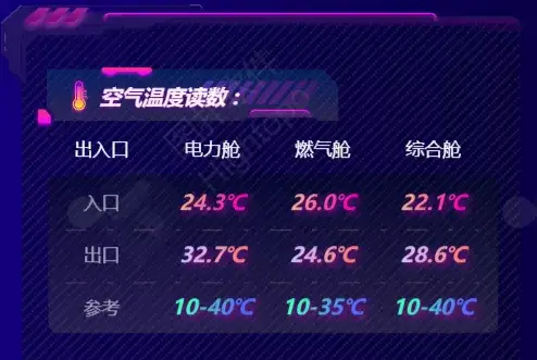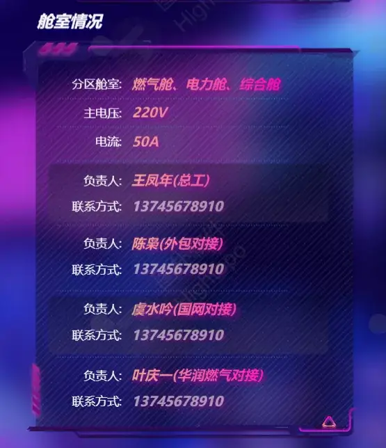 电力 1 舱、电力 2 舱、综合舱和燃气舱共 4 个舱室的电压、电流、负责人和联系方式展示,便于出现问题后及时沟通处理。