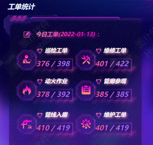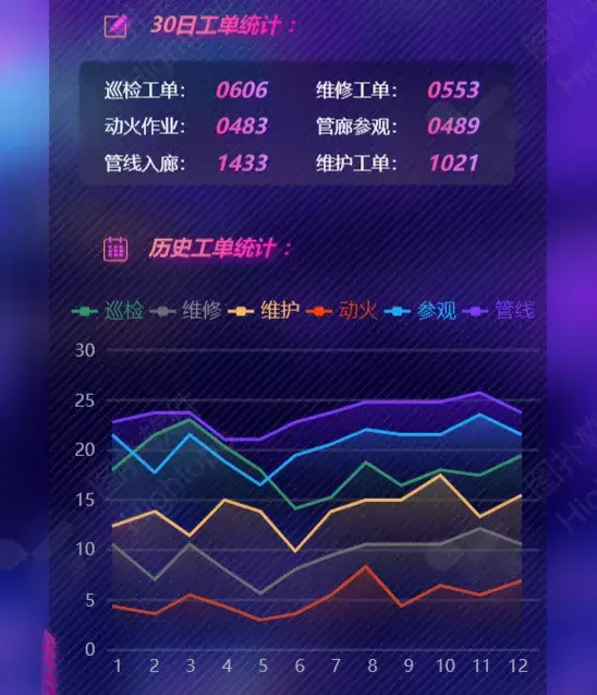 巡检工单、维修工单、动火作业、管廊参观、管线入廊、维护工单分别统计,30 日工单数量累计展示,采用折线图展示历史工单的统计情况。