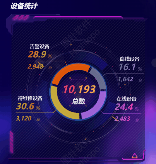 通过 Hightopo 地下综合管廊智慧管理 Web平台,工作人员轻点鼠标,就可以清楚看到各个舱内的运维、保养、故障维修等情况统计数据。用环形图展示离线设备、在线设备,告警设备、待检修设备的比率,如果离线设备过多,应派员工进入综合管廊进行实地检测。