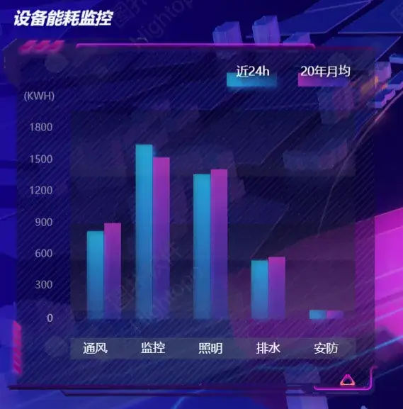 采用柱状图分别对比通风、监控、照明、排水、安防的能耗数据并进行存储和管理,识别能耗较大的设备并采取调整措施。能耗历史的统计方便管理者对系统事件和报警进行历史追溯,查询统计、事故分析。