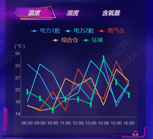 HT 可视化大屏,利用各种图表实时展现“地下生命线”各项健康指数:氧气、温度、湿度、通风,如果电力舱、燃气舱、综合舱内哪项指数异常监控平台都会自动报警。如果某一地段含氧量过低,可通过图扑的可视化大屏结合 GIS 快速定位问题点,及时安排人员进行救援。Hightopo 与 GIS 的结合可有效缩短救援时间。