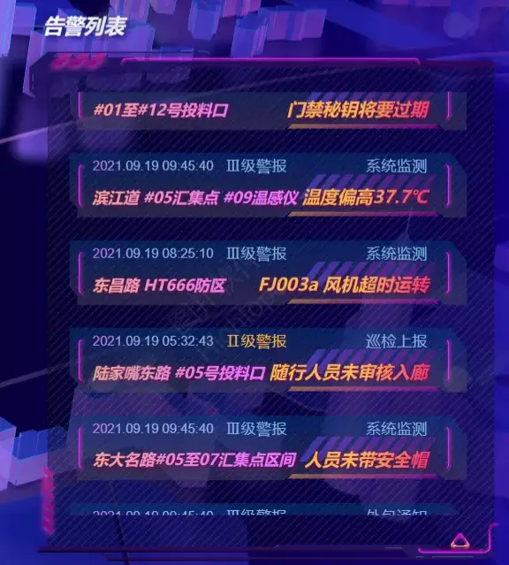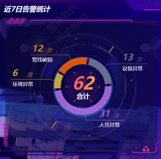 7 天内管线破损、人员异常、环境异常、设备异常的告警数据采用环形图展示,让管理者清楚告警的构成情况。告警列表动态显示警报级别和故障地址,便于统计事故易发地。