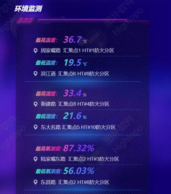 通过 HT 可视化系统将温湿度探测器、氧气传感器、有害气体和积水监测、自动报警和灭火等各种设备的运行状态展示。轮播报警触发的情况,做到全方位监测无死角,全时段监测不遗漏,帮助管理者及时发现问题、解决问题,排除隐患。