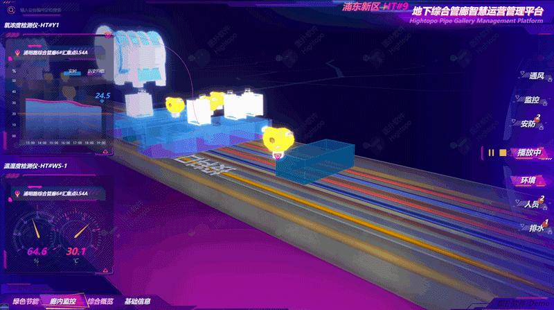 Hightopo 采用轻量化三维建模技术,高仿真模拟综合管廊内部场景,以 3D 场景为基础,2D 数据面板为辅,数字化展现城市地下隧道空间,了解电力、通信,燃气、供热、给排水等各种工程管线的铺设情况,并在图扑可视化大屏进行检修口、吊装口和监测系统的查看。