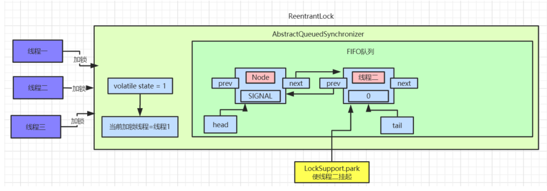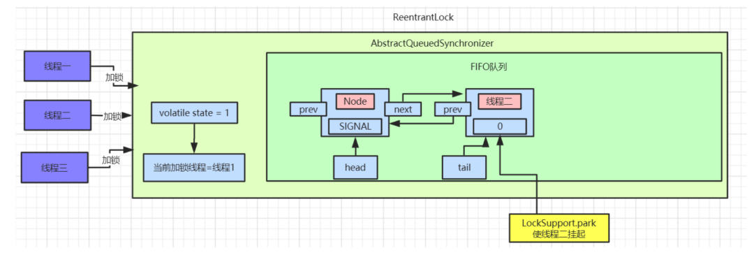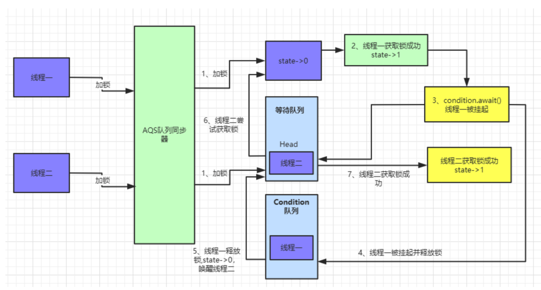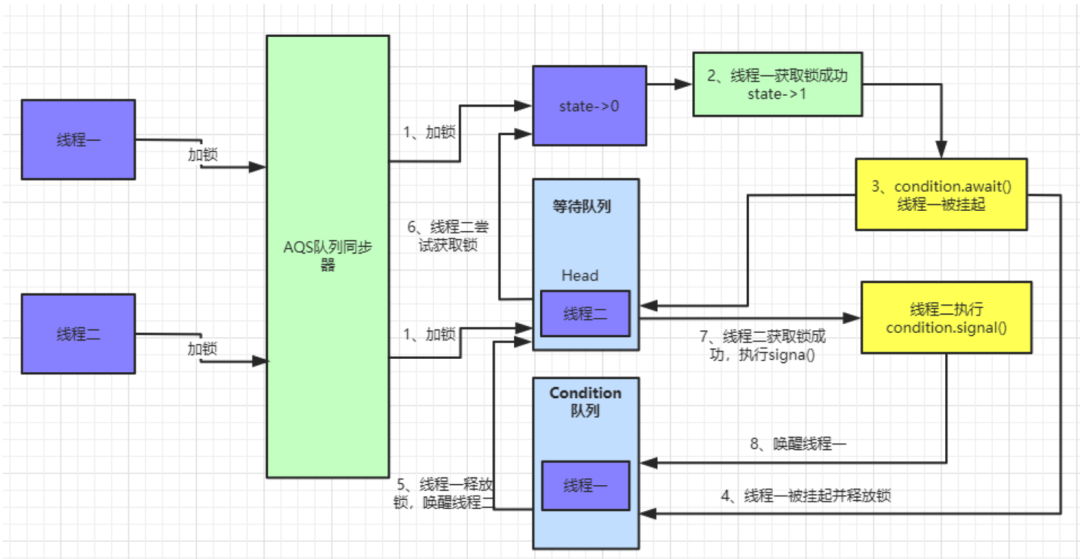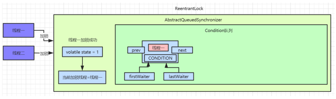 Condition中当前线程。此时线程一被挂起,线程二获取锁成功。