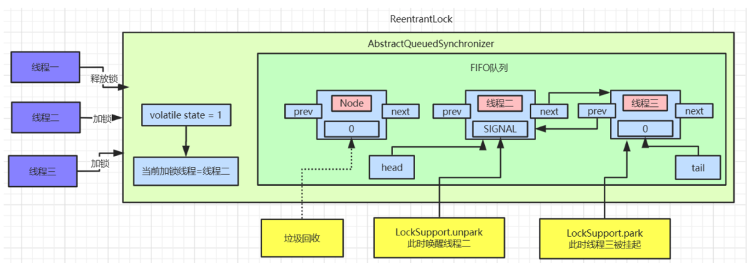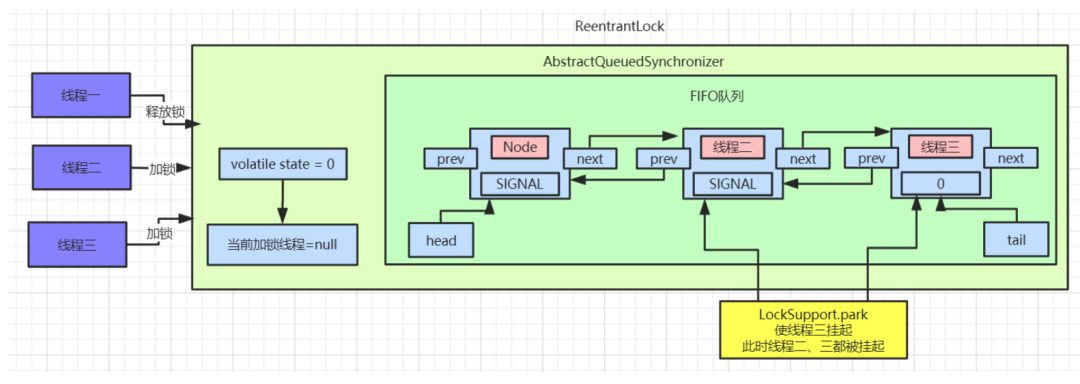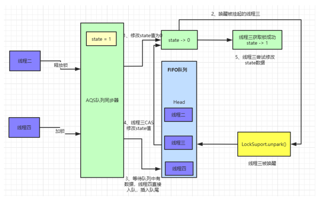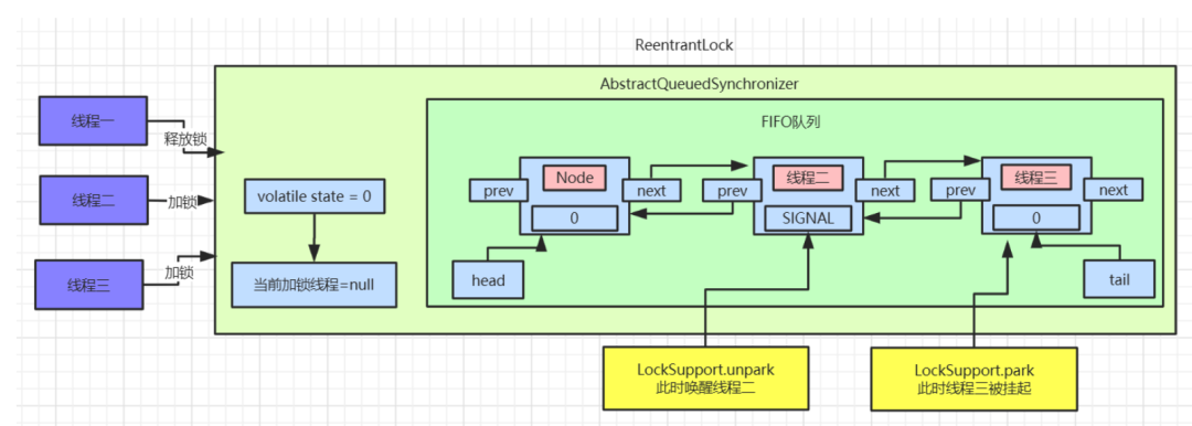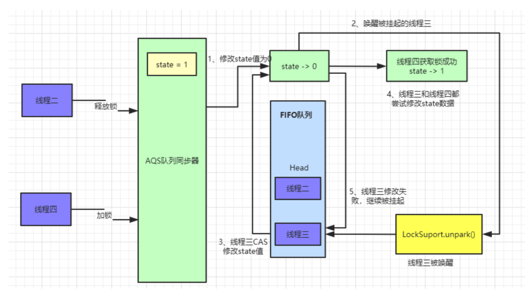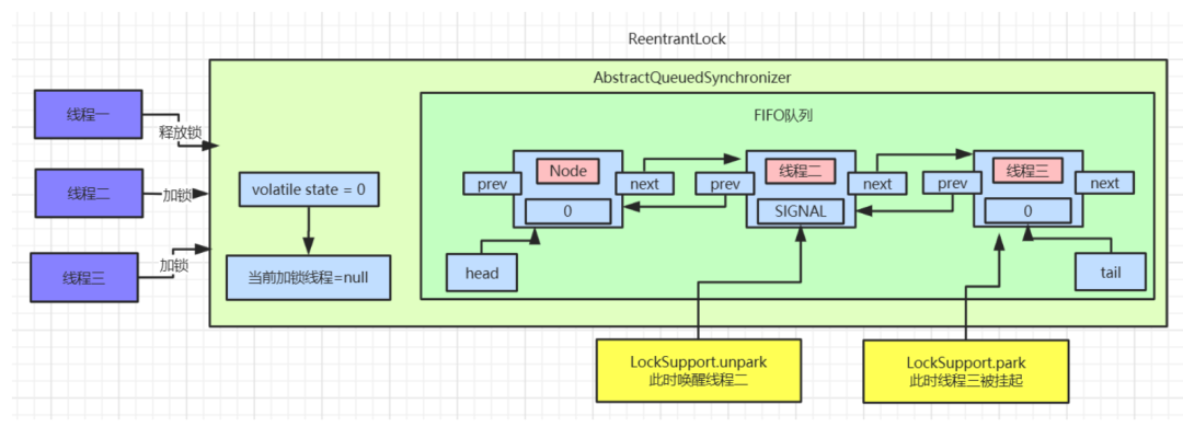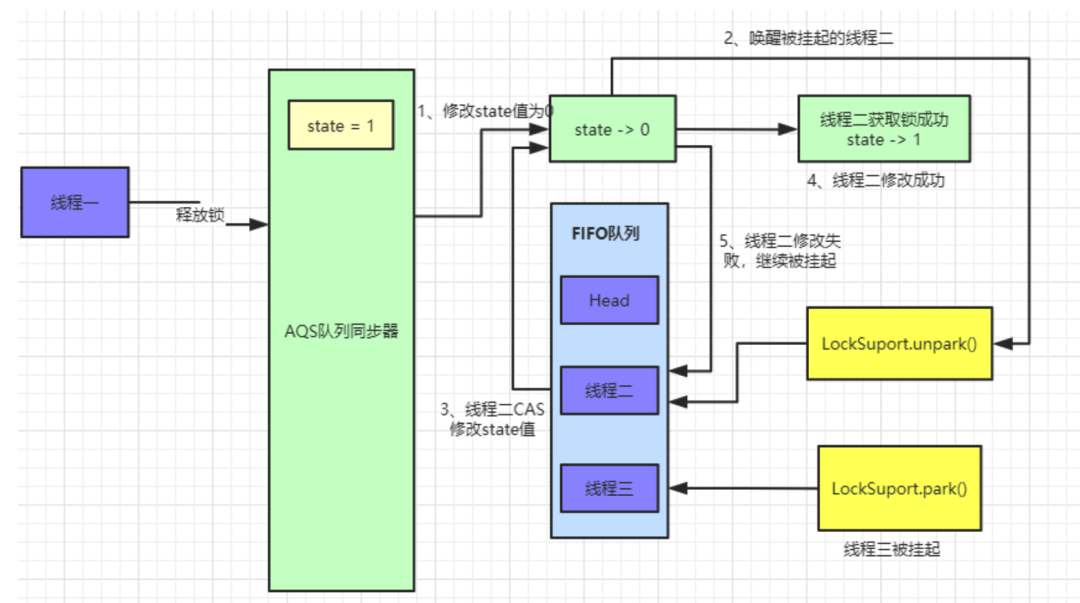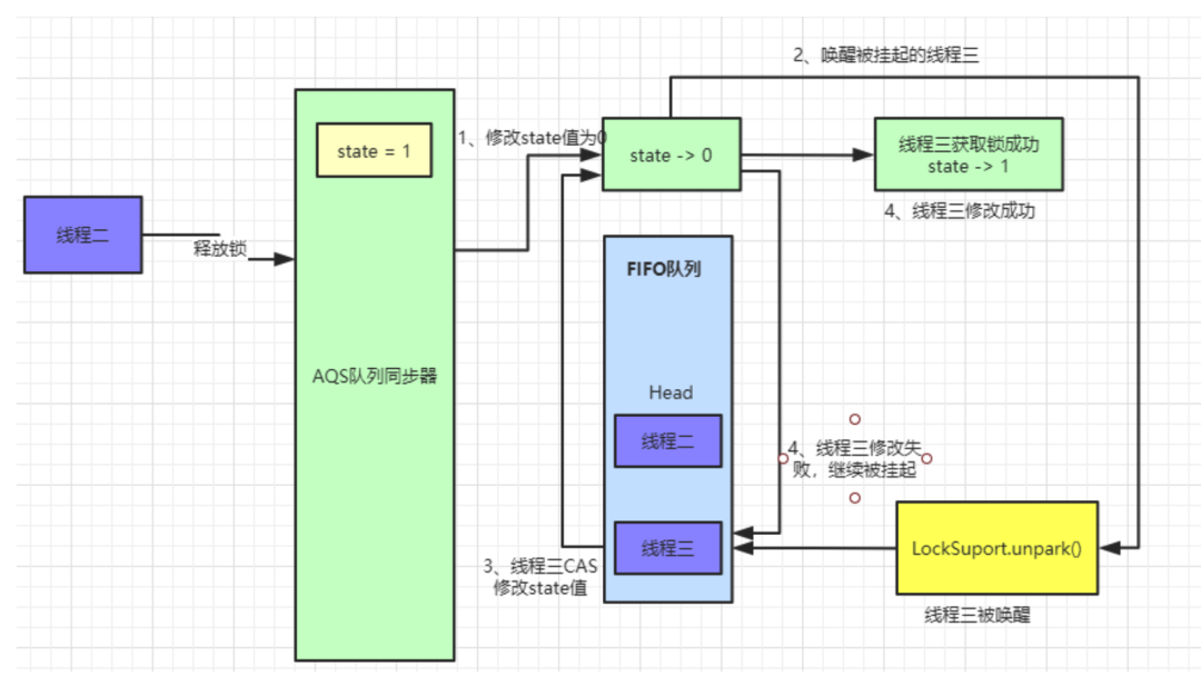 release()方法,释放锁后此时会唤醒被挂起的线程二,线程二会继续尝试获取锁。