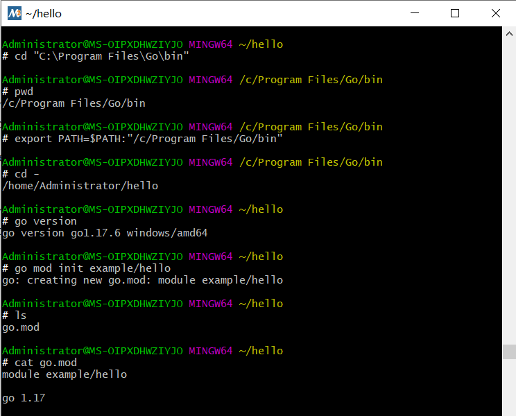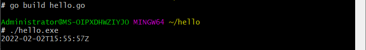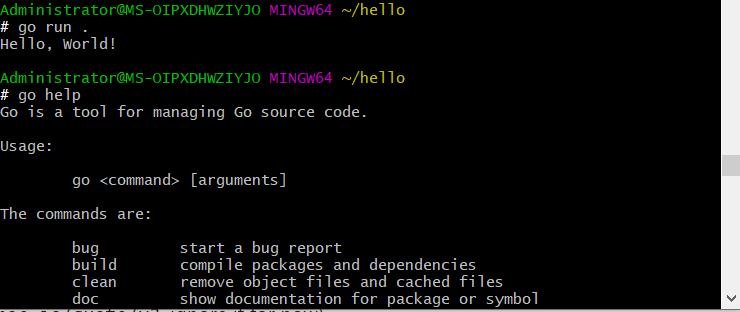 然后测试 go 语言版本的 hello world,这里介绍了第一个 package fmt,这个 package 的作用是格式化输出。在 msys2 环境下将 go 可执行文件的目录加到 PATH 变量中,然后执行以下命令创建测试代码目录: