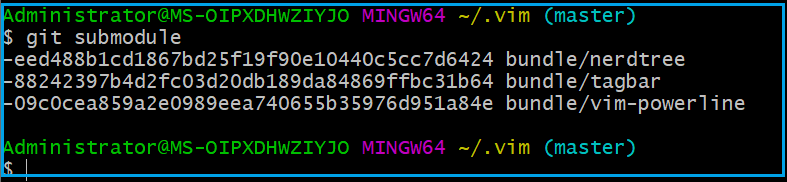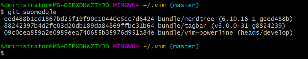 Administrator@MS-OIPXDHWZIYJO MINGW64 ~/.vim (master)$ ls bundle/nerdtree/ tagbar/ vim-powerline/Administrator@MS-OIPXDHWZIYJO MINGW64 ~/.vim (master)$ find bundle/bundle/bundle/nerdtreebundle/tagbarbundle/vim-powerline