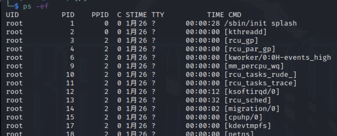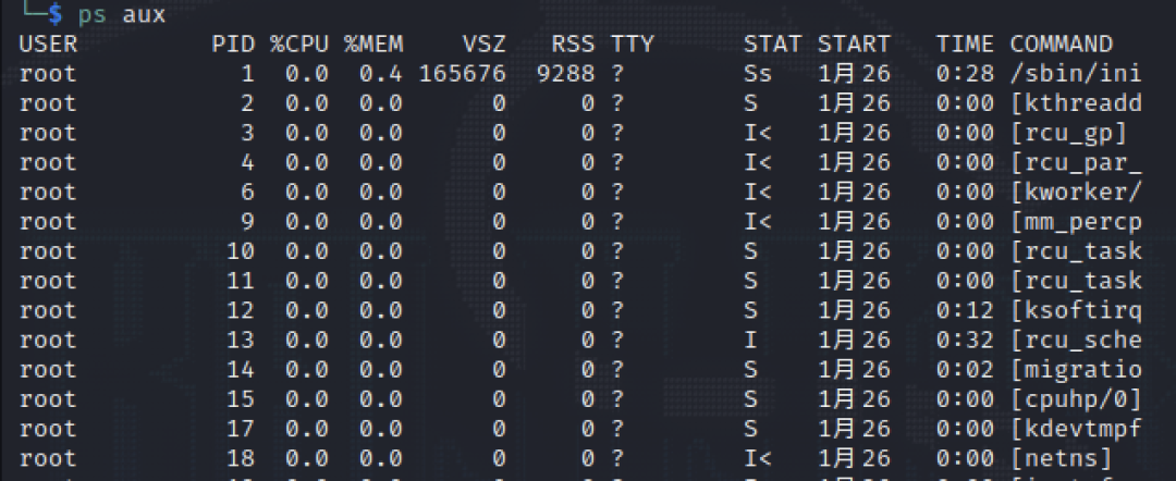 参数含义: 1.UID 用户ID 2.PID 进程ID 3.PPID 父进程ID 4.C CPU占用率 5.STIME 开始时间 6.TTY 开始此进程的TTY----终端设备 7.TIME 此进程运行的总时间 8.CMD 命令名 ps aux