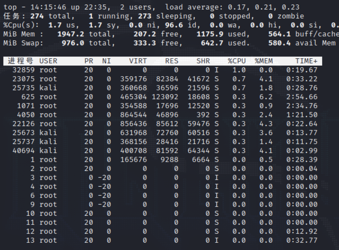 参数含义: USER //用户名 %CPU //进程占用的CPU百分比 %MEM //占用内存的百分比 VSZ //该进程使用的虚拟內存量(KB) RSS //该进程占用的固定內存量(KB)(驻留中页的数量) STAT //进程的状态 START //该进程被触发启动时间 TIME //该进程实际使用CPU运行的时间 top (动态查看进程)