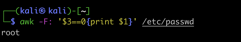 awk -F: '$3==0{print $1}' /etc/passwd #查看超级用户(uid=0)