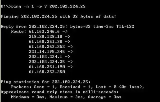 ping -n 1 -r 9 202.102.224.25 (发送一个数据包,最多记录 9 个路由)