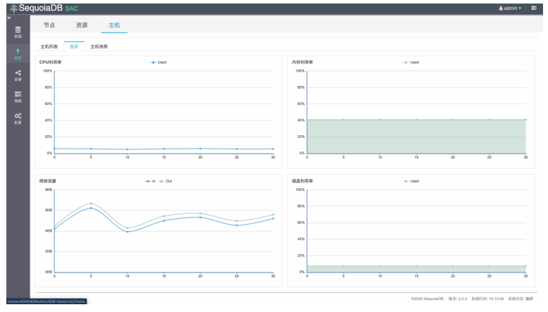 在 SequoiaPerf 的首页上,用户可以对 SequoiaDB 数据库集群运行情况做一个宏观的浏览,快速查阅当前集群的运行情况。