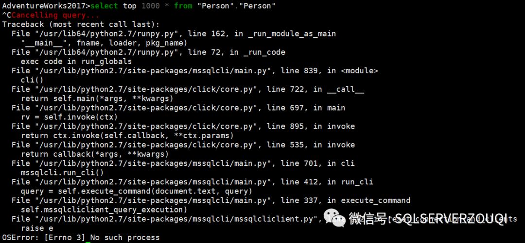 查询返回的数据较多,返回结果较慢;查询较大的数据,很慢。若是等不及按下两次ctrl+c,会如下错误。