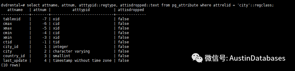 select attname, attnum, atttypid::regtype, attisdropped::text from pg_attribute where attrelid = 'city'::regclass;
