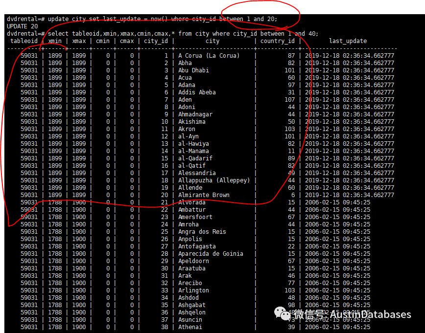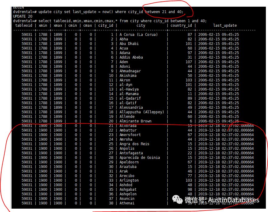 我们选择一个city 表,然后我们开两个事物,一个更新city_id 1 - 20 另一个事物更新city_id 21 40