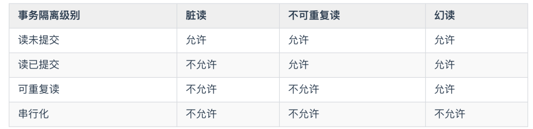 其中隔离级别由低到高是:读未提交 < 读已提交 < 可重复读 < 串行化