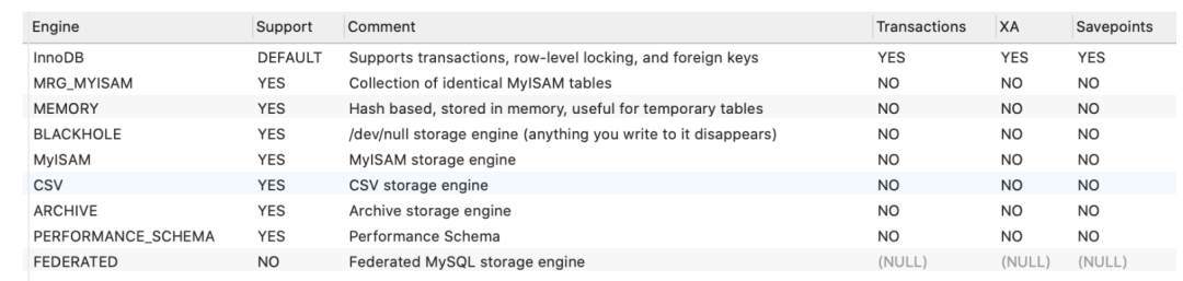 可以看到,InnoDB 是 MySQL 默认支持的存储引擎,支持事务、行级锁定和外键。