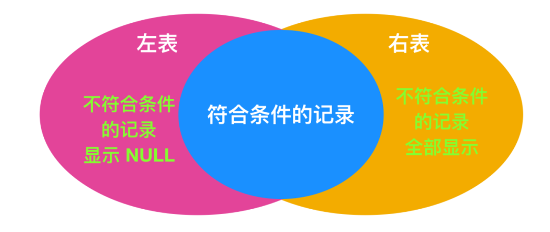 右外连接:也被称为右连接,他与左连接相对,这种连接方式会显示右表不 符合条件的数据行,左表不符合条件的数据行直接显示 NULL