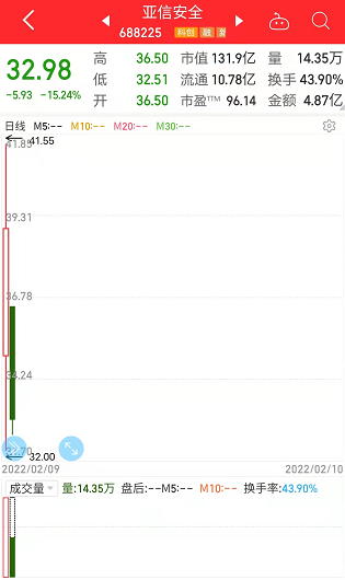2022年2月9日,亚信安全登陆科创板。开市之后,股票走势高开高走。盘中最高涨幅36.18%,最终收于27.53%。然而,2月10号其股票大幅下挫,截止12:00,下跌了15.24%。目前亚信安全的市值131.9亿,市盈率(TTM)96.14。其股票换手率达到43.9%,市场预期分化严重。