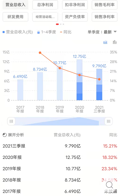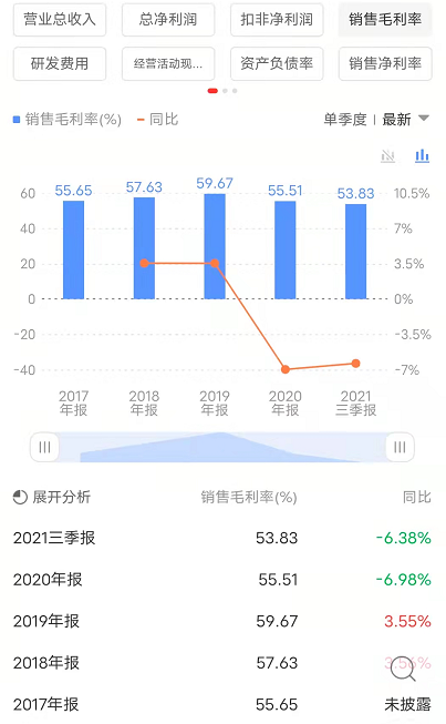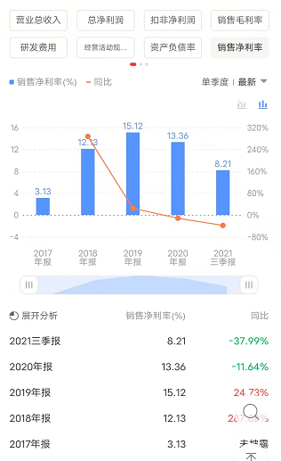近几年公司的销售净利率快速下降,尤其是2021年前三季度,销售净利率下降了37.99%。2019年。销售净利率最高达到了15.12%,到2020年则下降到了13.36%,2021年前三季度进一步下降到8.21%,跌破了10%。