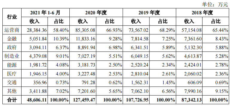需要指出的是,亚信安全的营收高度依赖于电信行业,近几年,来自电信客户的营收占比分别为65.44%、68.29%、66.93%和58.40%。其中,亚信安全第一大客户是中国移动,近几年移动的销售收入占同期主营业务收入的比重分别为 23.88%、37.40%、36.38%和 37.05%,这个比例偏高。