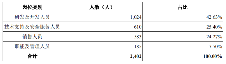 目前,亚信安全员工总数为2402人,研发及开发人员1024人,占员工总人数的比例达42.63%。其中研发人员438名,占比18.23%。