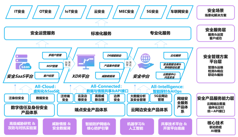 亚信安全提出了“安全定义边界”的理念,以身份安全为基础,以云网安全和端点安全为重心,以安全中台为枢纽,以威胁情报为支撑。亚信安全的安全平台,采用六层架构多形式交付的方式,其安全智能平台包括安全SaaS平台、安全中台、XDR平台。