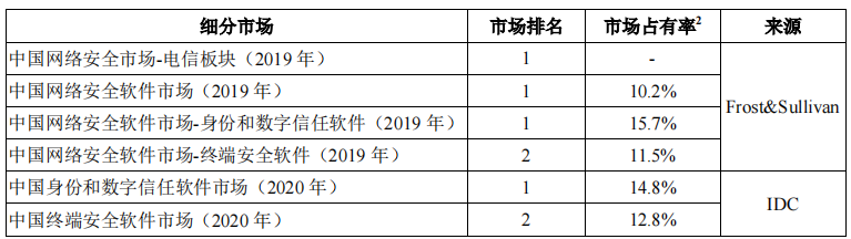 在IDC发布的2019年下半年及2020年下半年中国 IT 安全软件市场跟踪报告中,亚信安全在2019年和2020年中国身份和数字信任软件市场份额中排名第一,市场占有率为14.8%;在中国终端安全软件市场份额中排名第二,市场占有率为12.8%。