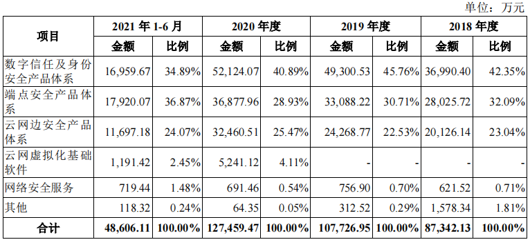 数字信任及身份安全产品,2018年-2020年贡献的营收占比都超过40%,从趋势上看,这块业务的营收占比下降,2021年上半年的营收占比为34.89%;其次是端点安全产品,近几年的营收占比都在30%左右,2021年上半年营收占比36.87%,首次超过数字信任及身份安全产品;云网边安全产品的营收占比比较稳定,占四分之一左右;云网虚拟化基础软件业务是从2020年才开始的,占比还较小,2020年营收占比4.11%,2021年上半年为2.45%。网络安全服务贡献的营收在2021年刚刚超过1%,其他业务的营收占比小于1%。