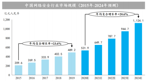 根据 Frost&Sullivan 的研究报告,中国网络安全市场规模从2015年的 209.6 亿元增长至 2019年的 489.2 亿元,年均复合增长率达到了 23.6%。2022年,中国网络安全市场的规模预计将达到787.7亿元,2024年预计将超过1000亿元。2020年-2024年这5年时间内,中国网络安全市场的年均复合增长率约为20.6%。