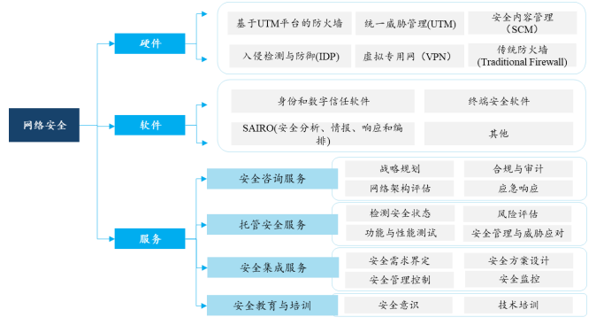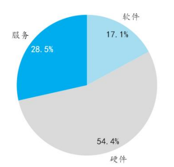 最后,我们再从产品角度来分析中国网络安全市场的结构。按产品结构来看,网络安全市场可以划分为安全硬件市场、安全软件市场个安全服务市场三大类。