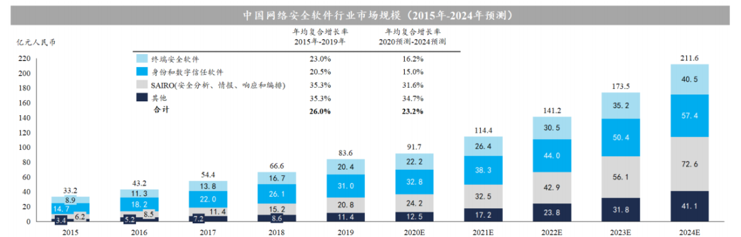 根据Frost&Sullivan的数据,中国网络安全软件市场规模从2015年的33.2亿元快速增长至2019年的83.6亿元,年均复合增长率为26.0%。