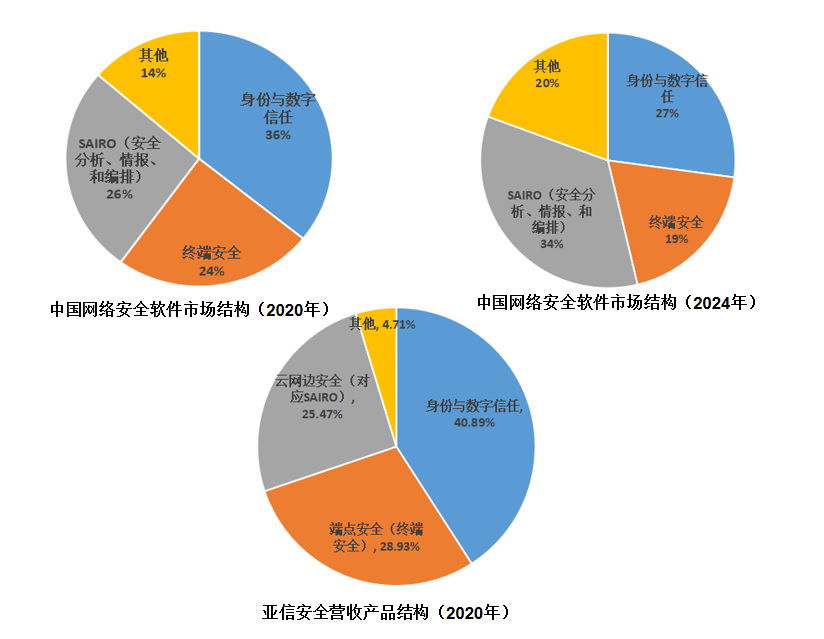 我们将中国网络安全软件市场和亚信安全的营收结构做个对比,2020年亚信安全的营收结构与中国网络安全软件市场结构是大体对应的。从中国网络安全软件市场的发展态势来看,身份与数字信任和终端安全的市场占比将降低,SAIRO(安全分析、情报、响应和编排)的占比将提高。对应的,亚信安全接下来需要重点发展其云网边安全产品,提升安全分析、情报、响应和编排方面的技术能力。