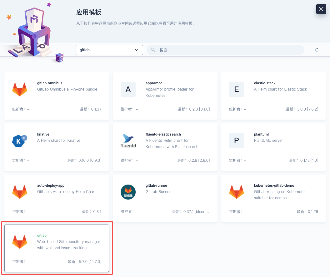 项目,从「应用负载」下面的「应用」页面创建 GitLab 应用:选择「从应用模版」创建即可得到如下界面,由于仓库内可安装的 Helm Chart 较多,注意选择红框指示的这个应用(撰稿时 Chart 最新版为 5.7.0