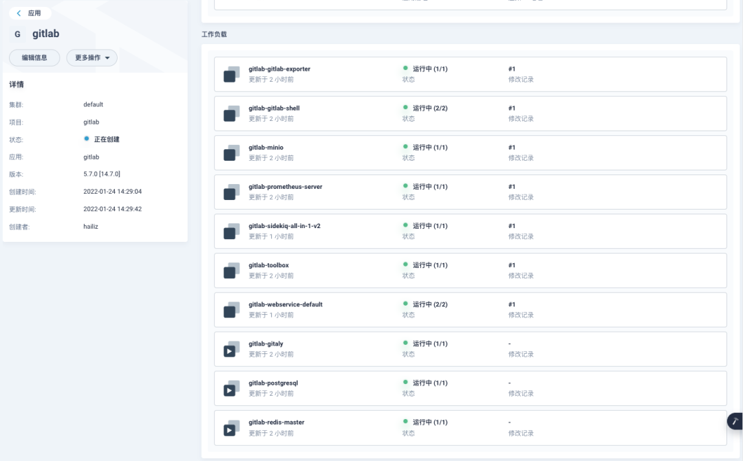 应用的「工作负载」部分查看到所有负载都在运行中的状态。