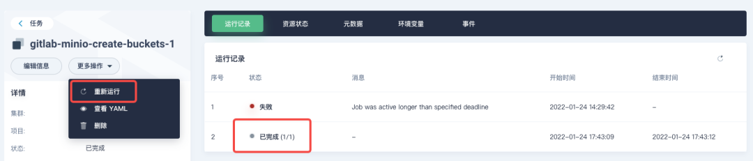 任务,如果失败可以通过详情页左侧「更多操作」来「重新运行」,最终得到已完成(1/1)