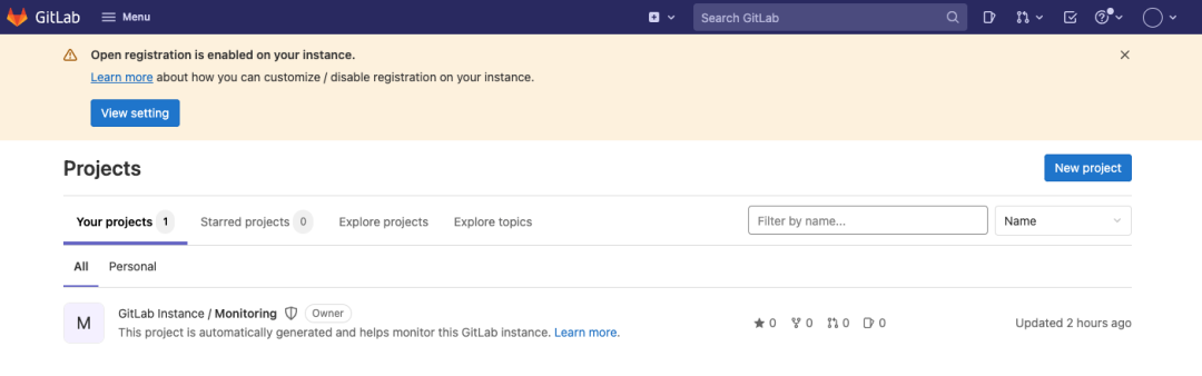 作为用户名,即可登陆 GitLab 得到如下图所示的界面。