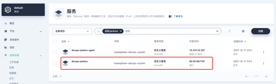 在 KubeSphere 中启用 DevOps 套件可以参考文档:启用可插拔组建 · KubeSphere DevOps 系统[3]。安装完成后可以在「平台管理」页面的「系统组建」部分看到 Jenkins 头像图标。