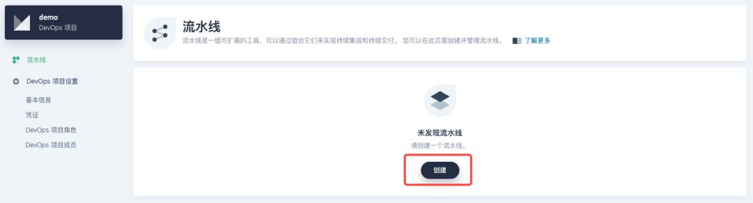 DevOps 项目首页,「创建」一个新流水线。这次在「创建流水线」面板中我们不绑定代码仓库,直接「下一步」再直接「创建」一个名为gui