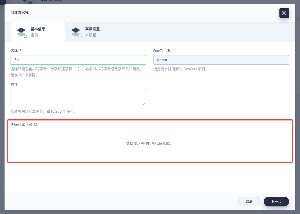 在弹出的「创建流水线」对话框中,我们填入一个流水线「名称」并点击下方「代码仓库(可选)」这个区域来进行代码仓库绑定。