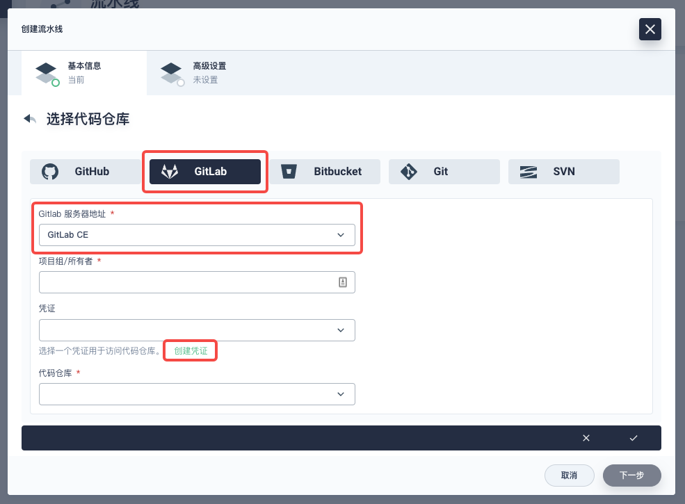 进入到「选择代码仓库」面板后,我们选择GitLab