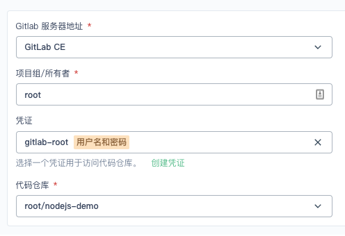 通过「确定」按钮保存凭证后回到「选择代码面板」,在「凭证」下拉框中选择刚刚创建的gitlab-root